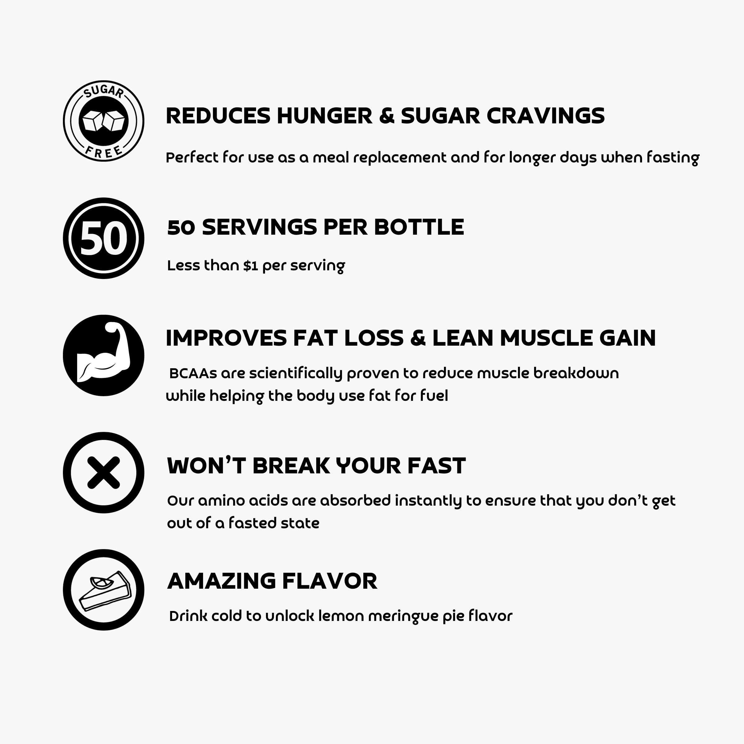 FastAid has no calories and will not spike your blood sugar so it's fine to take on fasting days. It can accelerate progress by keeping your body from burning off valuable muscle, and give you energy for your workouts.